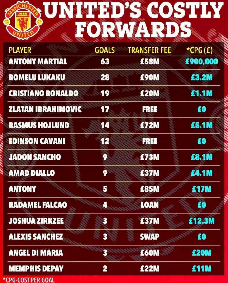 性价比最低的则是安东尼与迪马利亚:安东尼以8500万英镑只换来5球,单球成本高达1700万英镑;迪马利亚6000万英镑仅3球,达到2000万英镑/球,可谓灾难级投入产出。