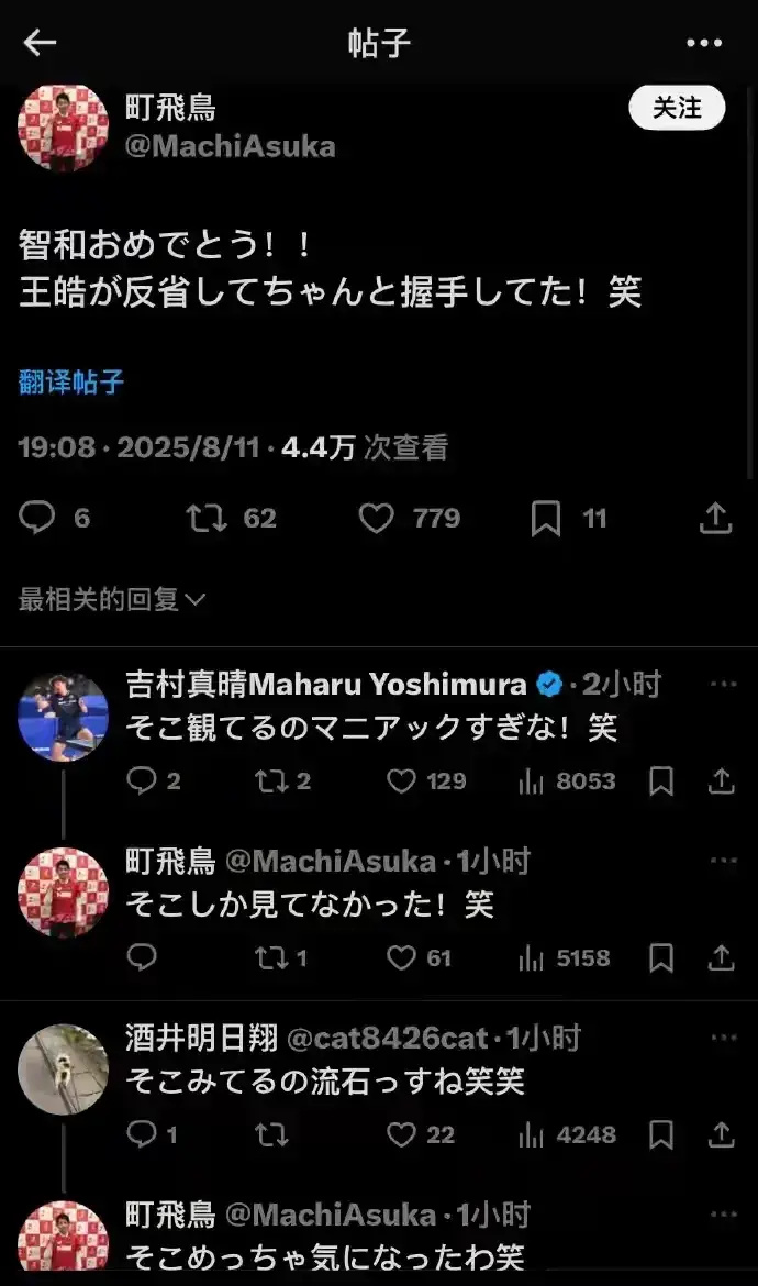 在社交媒体互动中,町飞鸟与酒井明日翔就某细节展开讨论,町飞鸟表示对此特别关注,酒井则调侃其观察细致。这段对话反映出公众对赛事细节的高度敏感性。
